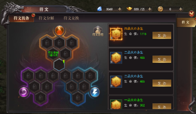 符文系统开启后玩家可根据自身的属性追求镶嵌对应属性的符文,还可将其余的符文分解成符文精华后对镶嵌中的符文进行升阶,大幅提升角色属性